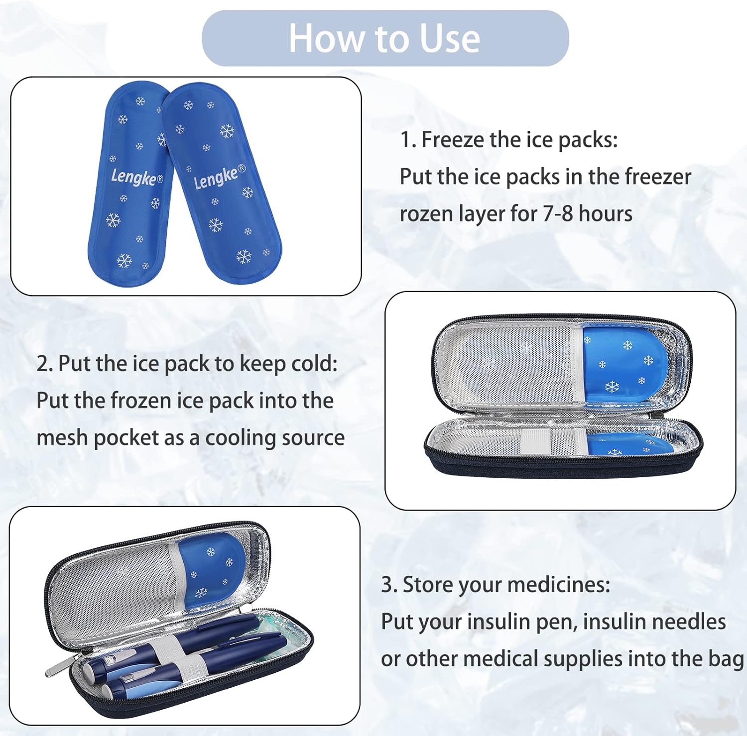 Use Instructions for Insulin Case: Put the ice packs in the freezer 7-8 hours before using the insulin bag, then put the frozen ice pack into the mesh pocket when using the insulin pack, then put your insulin pen, vial, or insulin needles into the bag.