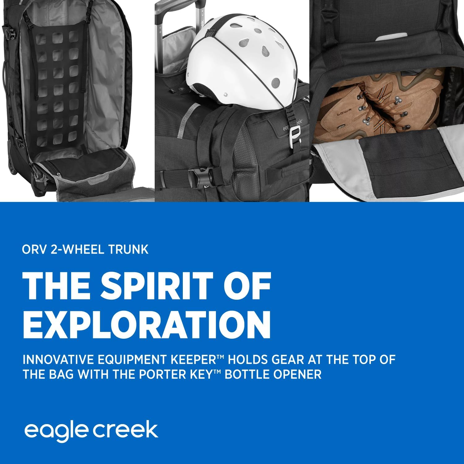EQUIPMENT KEEPER holds gear to the top of the travel bag, with the Porter Key bottle opener, and internal elasticized pockets for additional organization