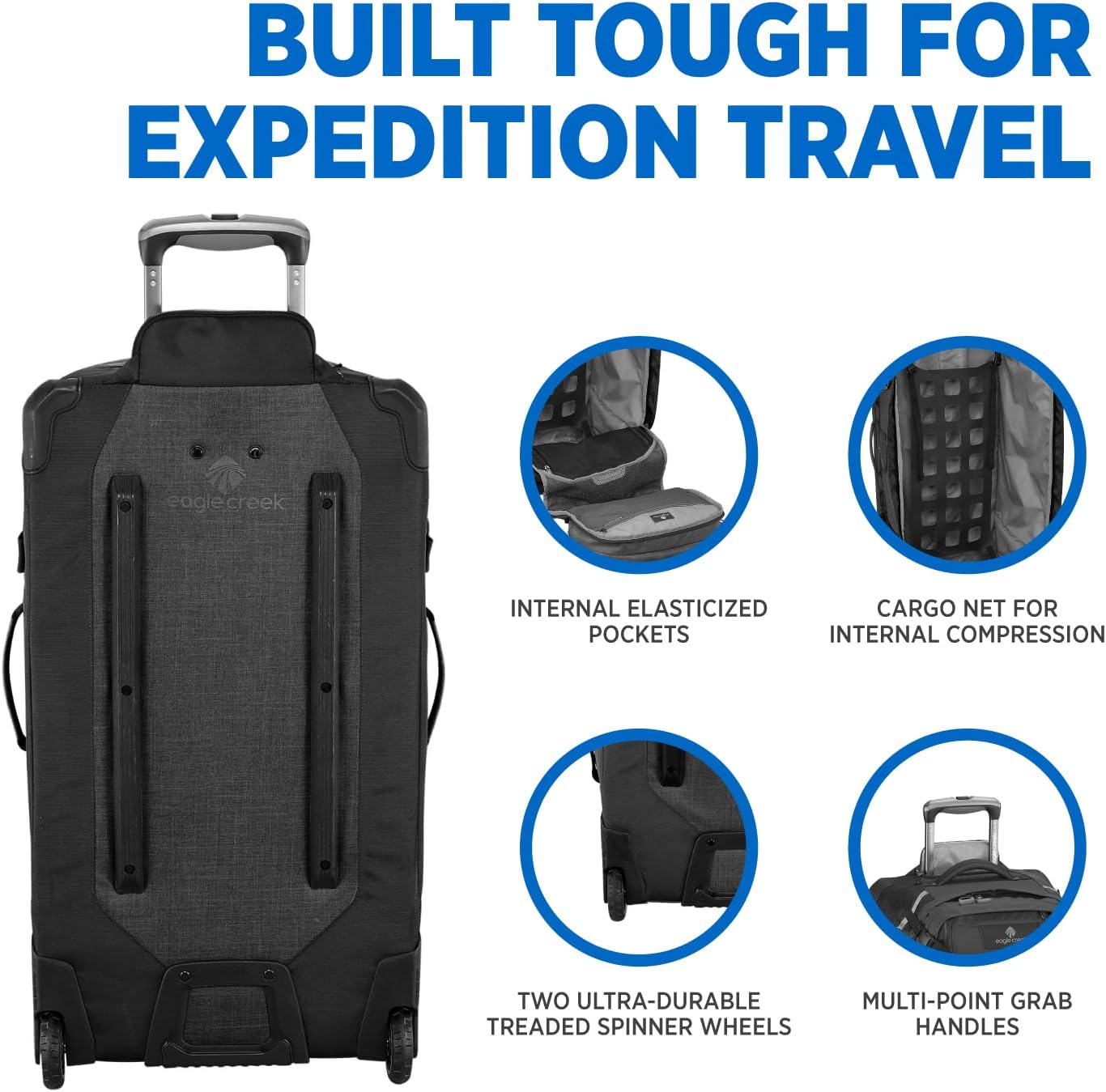 ROBUST 97-liter rolling luggage built with durable Bi-Tech and Bi-Tech armor fabrics for maximum abrasion and weather resistance, with puncture-resistant lockable zippers. Two oversized treaded wheels with heavy-duty housing, skid plate, and bumper protection