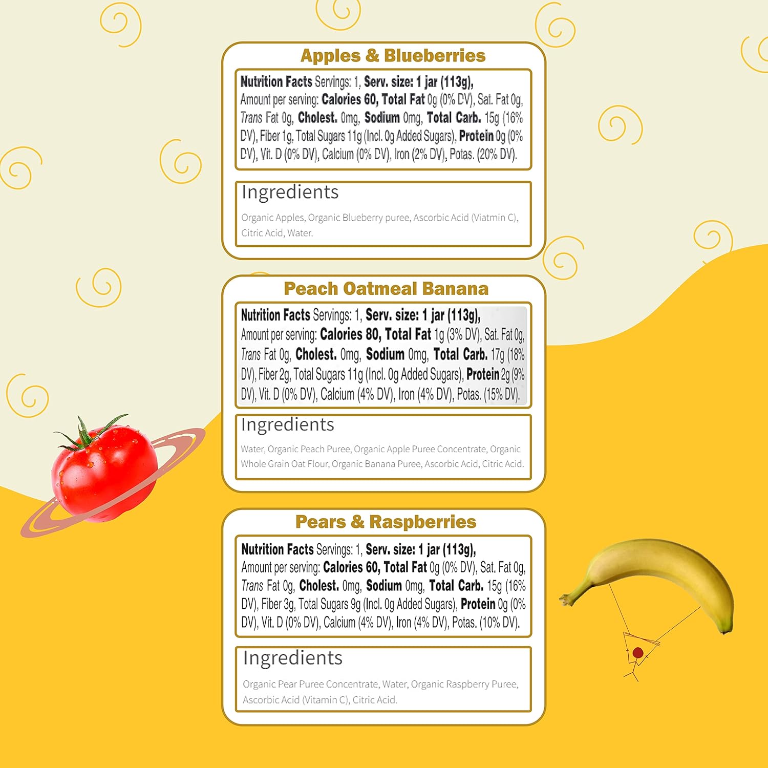 ORGANIC FRUIT VARIETY PACK: Includes twelve 4 oz glass jars of Earth’s Best Organic baby food (4 Peach Oatmeal Banana, 4 Pear and Raspberries, 4 Apples and Blueberries)
