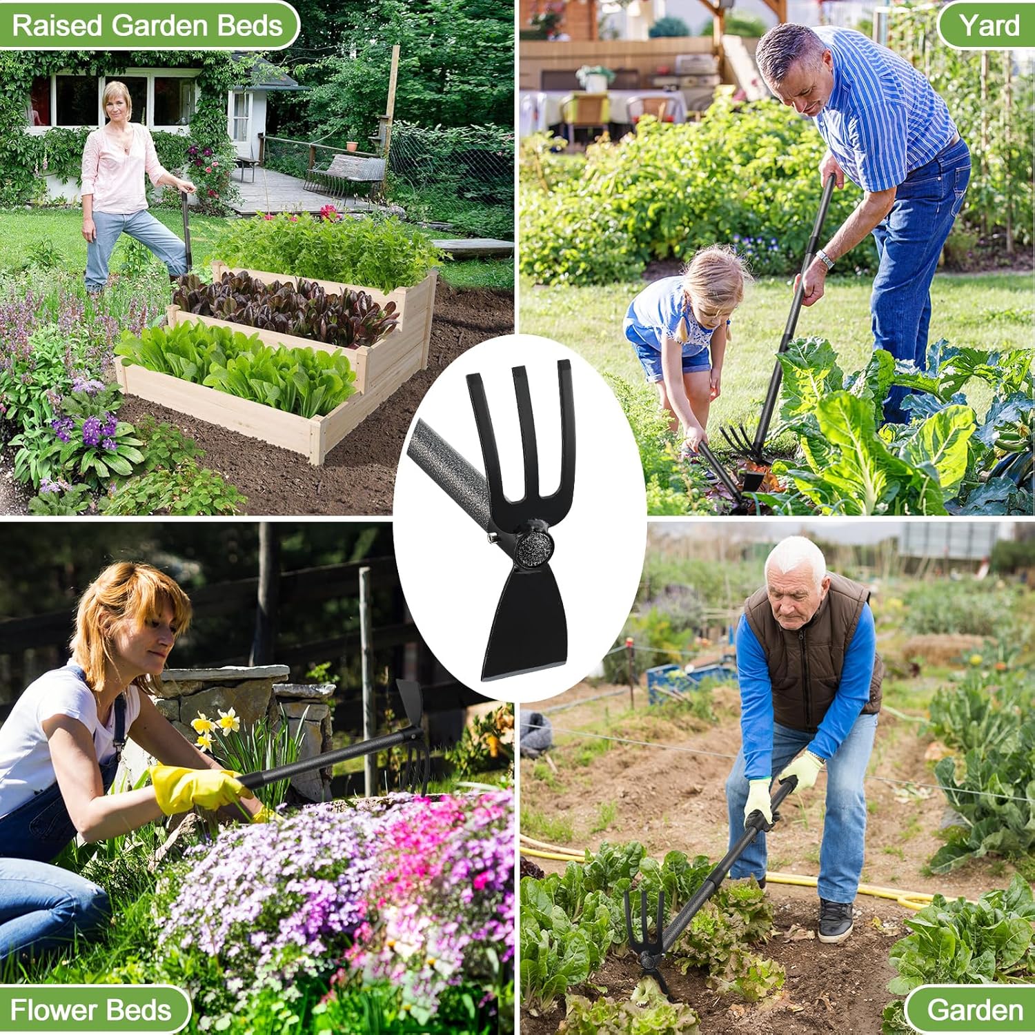 HEAVY DUTY CULTIVATOR HOE COMBO: This 2 in 1 garden hoe cultivator is constructed with sharp hoe blade for digging and thickened 3 prong for loosening soil.This weeding hoe has double heads are strongly welded in one piece which is not easy to break and is more robust.