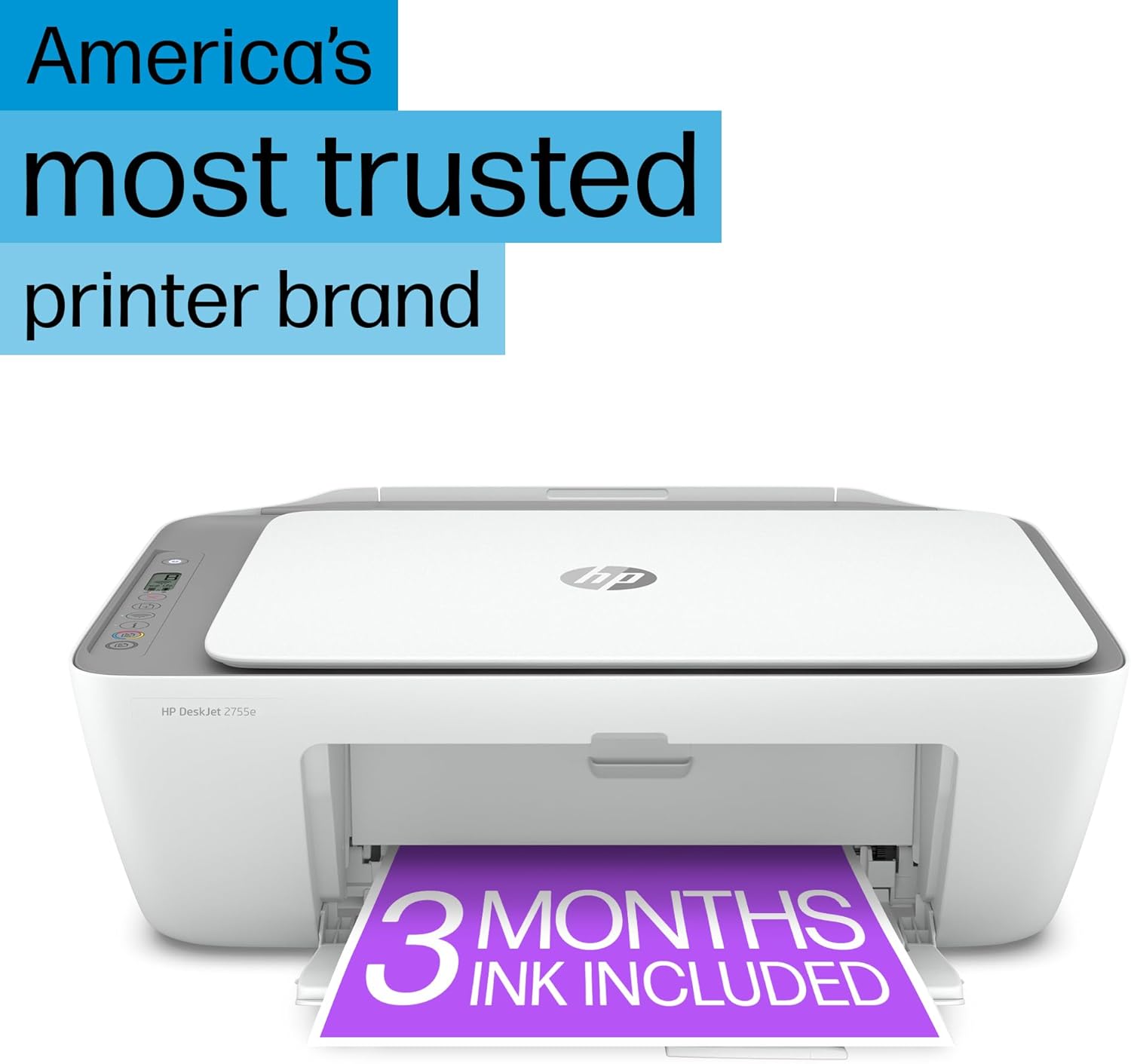 The HP DeskJet 2755e has the essential features you need to print basic color documents like recipes and forms. Print, copy and scan with ease, print from your phone and get easy setup. Includes the optional HP+ Smart Printing System that keeps itself up to date and ready to print from virtually anywhere at any time—at no additional cost.