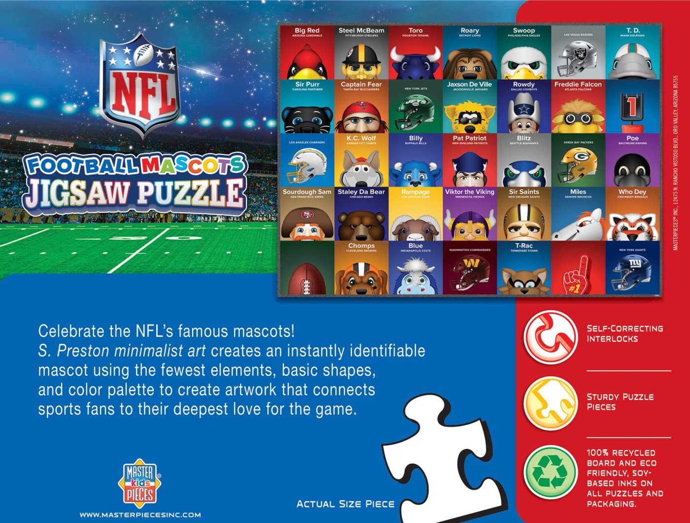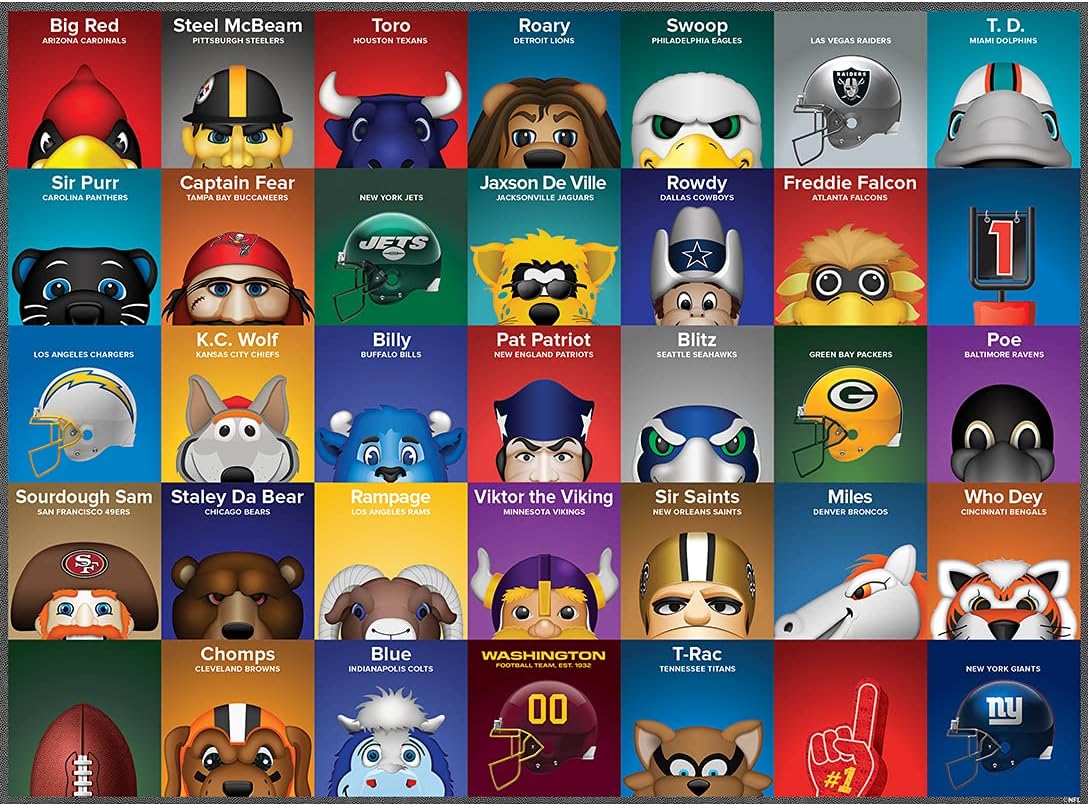 Delightful 100-piece puzzle featuring vibrant NFL Mascots artwork by S. Preston.