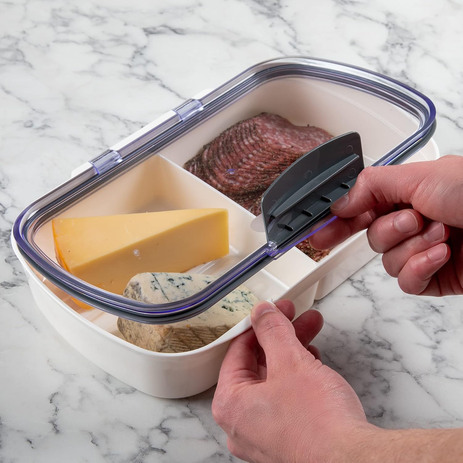 The ProKeeper by Progressive Split Deli Storage Container conveniently holds two different types of food. The silicone seal keeps meats cheeses and sliced bacon fresh for longer periods. It is designed with custom grooves in the bottom to catch any excess juices. The hinged lid easily flips back for a better dishwasher fit. Its slim and long design measures 11.75 inches for extended food storage.