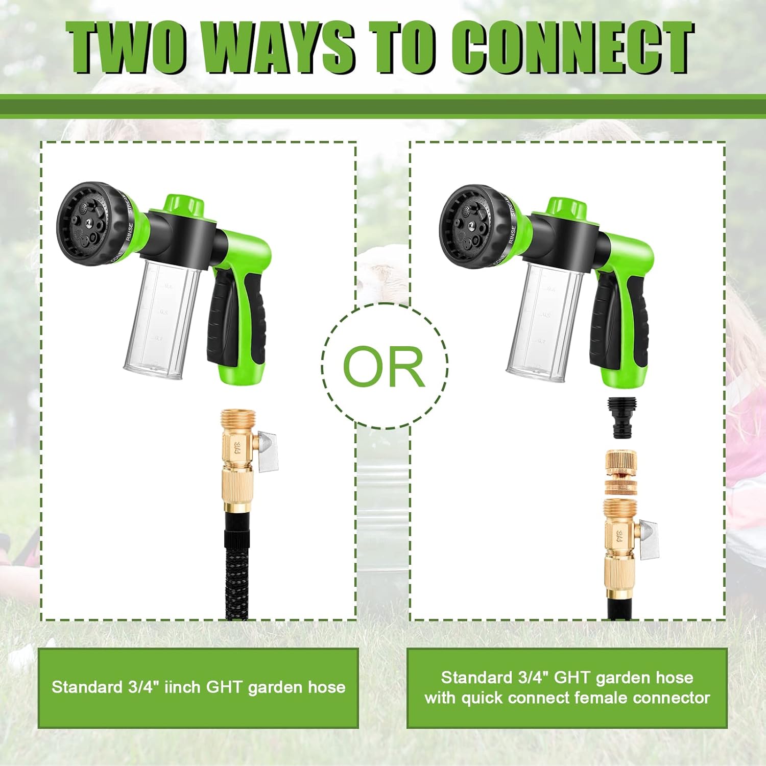 How to use: Connection 1 The standard 3/4″ garden hose can be screwed directly onto the bottom of the nozzle handle. Connection method 2 If a garden hose is not available, this product is suitable for hoses with an opening diameter of 12mm , standard connectors and universal connectors are used to connect 1/2″ or 3/4″ taps, simply insert the hose into the connector and tighten to use (product does not include hose)